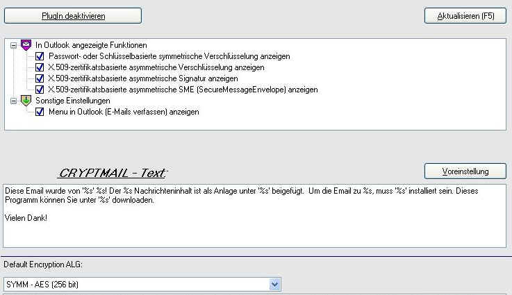 |  | Cryptmail Outlook PlugIn aktivieren / deaktivieren | Durch Aktivierung dieser Option wird in Outlook eine Schaltfläche (PlugIn) aktiviert, mit der E-Mails einfach verschlüsselt  und / oder signiert werden können. Diese Funktion ist mit Passwort, X.509-Zertifikat oder auch mit einem externen Schlüssel (Token) nutzbar. Siehe auch: Hilfe zum Outlook PlugIn |